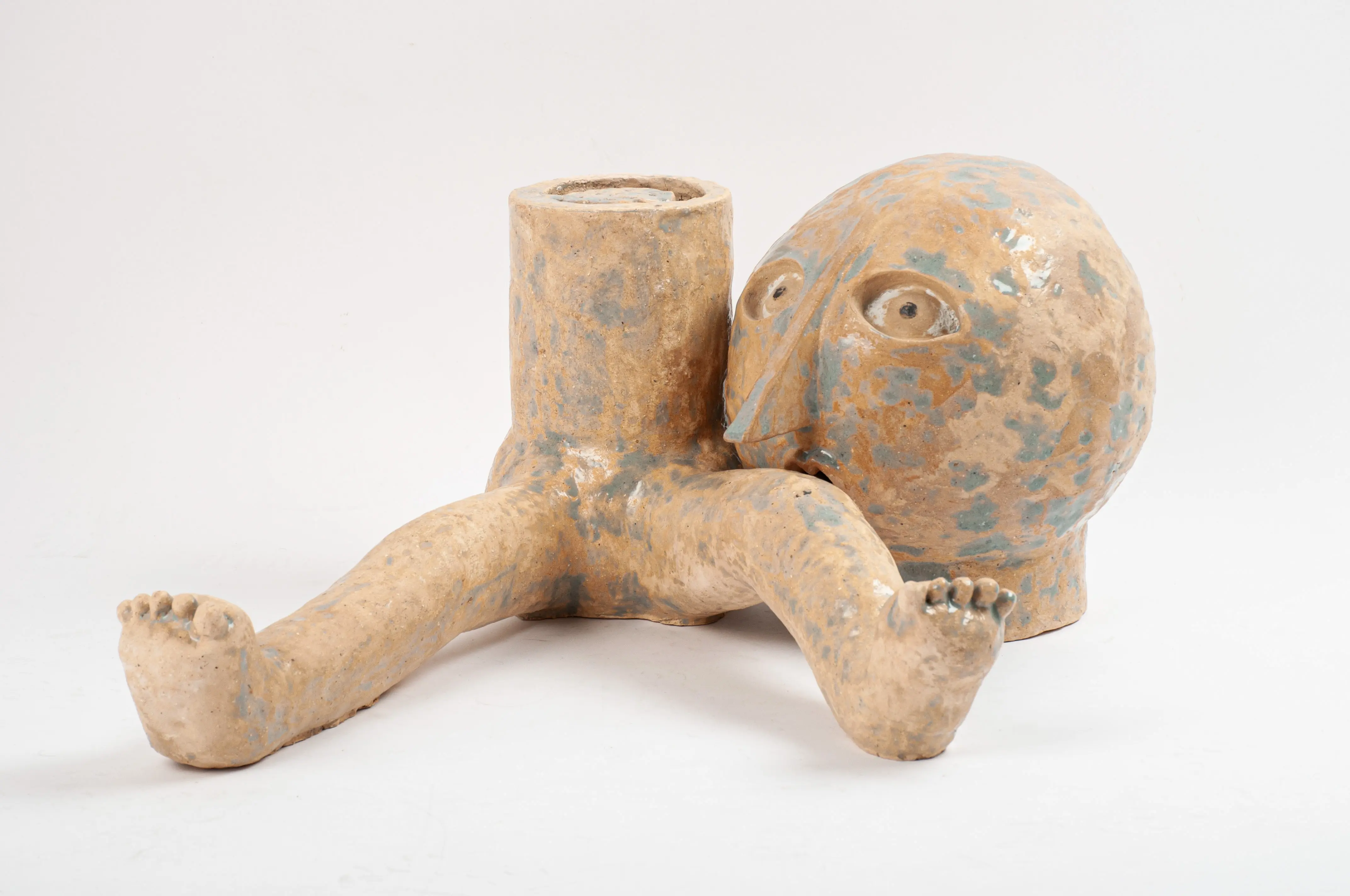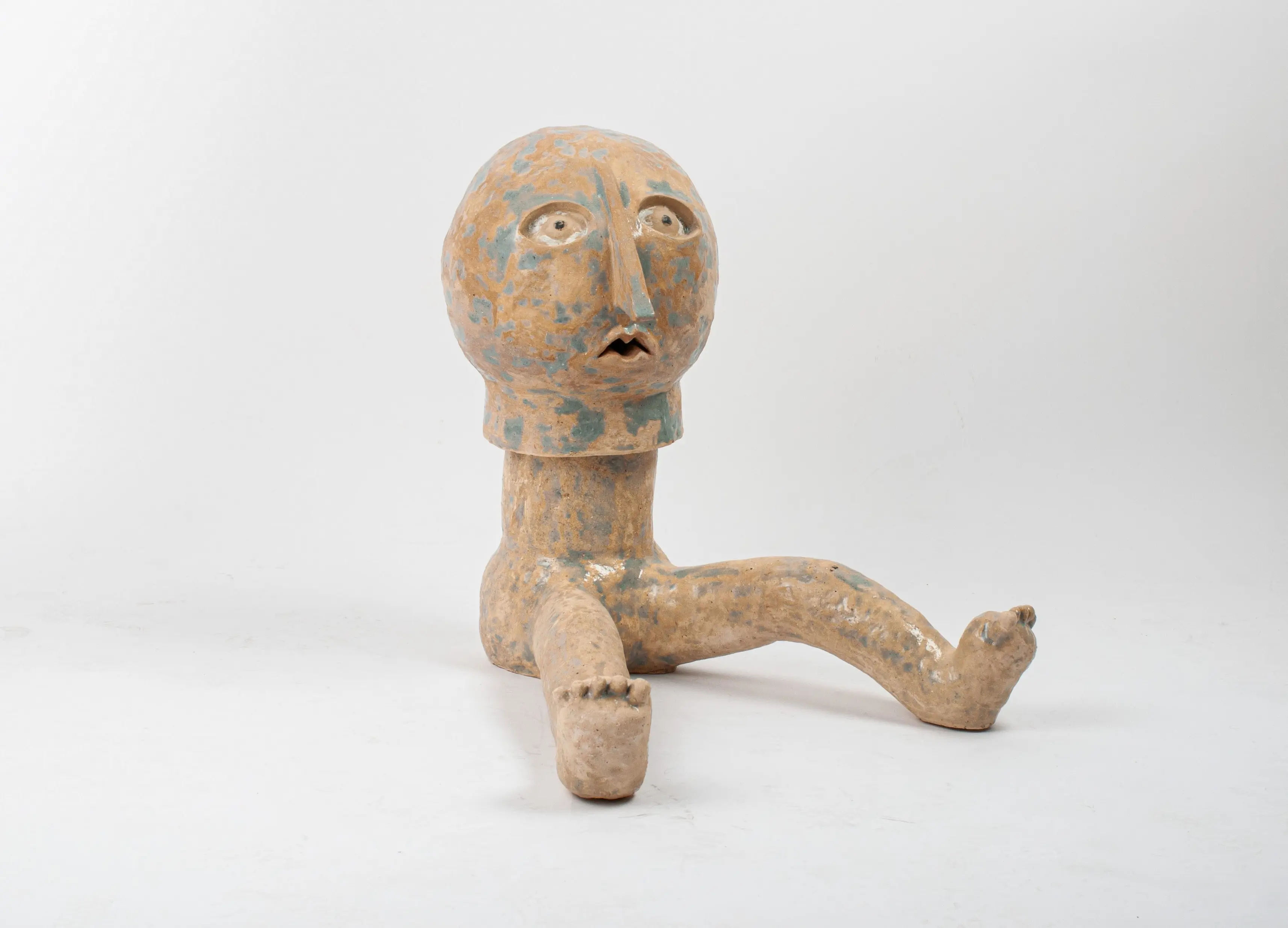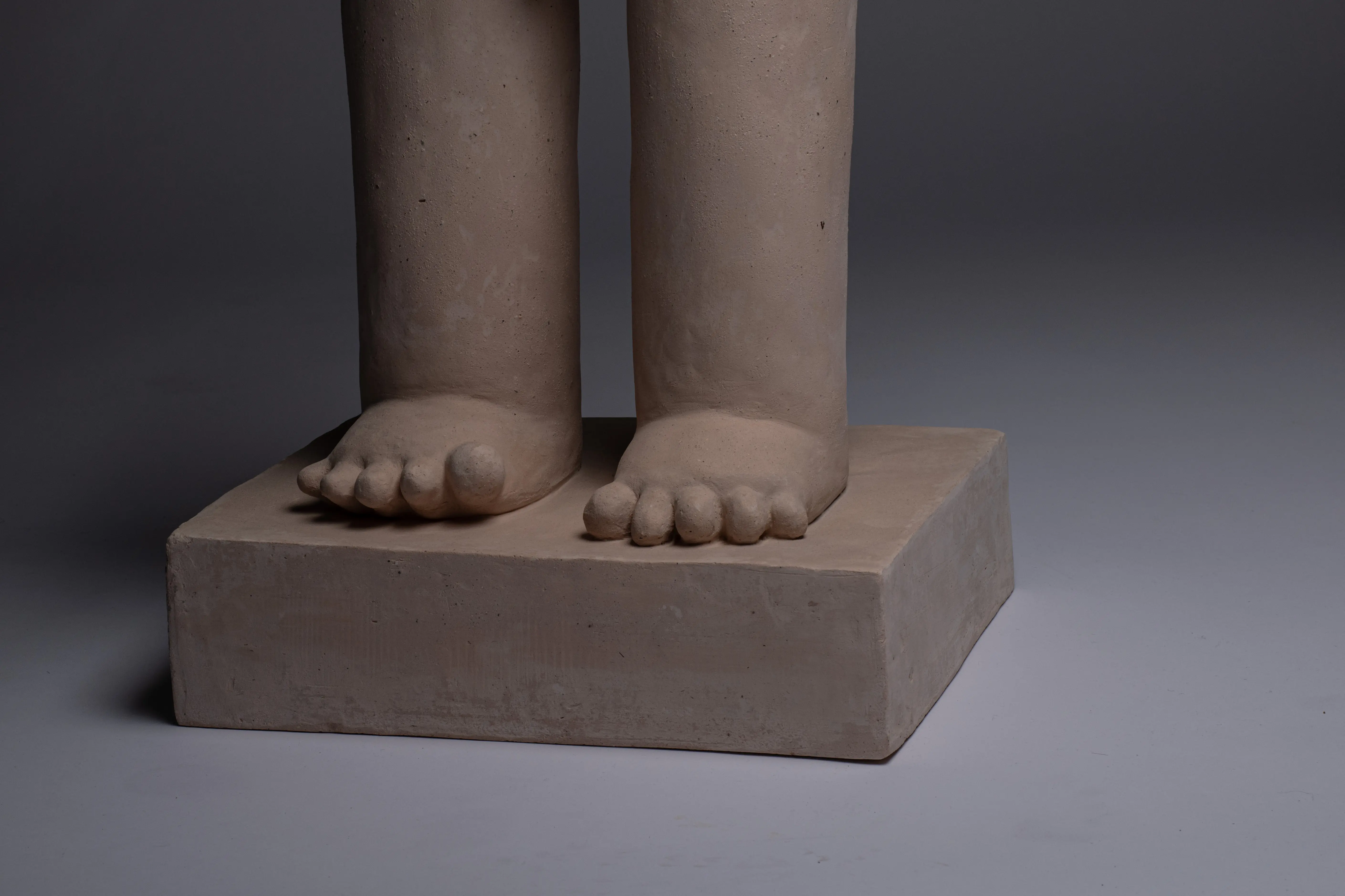 Although it is made up of abstract shapes, its entire surface is roughly structured and gives it an organic character. Its rounded and simplified forms, together with the expression on the face, are to underline the child's naivety and and grotesqueness. This shell with missing limbs emphasizes the limitation and deprivation of naturalness, symbolizing forced integration into society. Nothing of himself is admitted to him, only taken away.