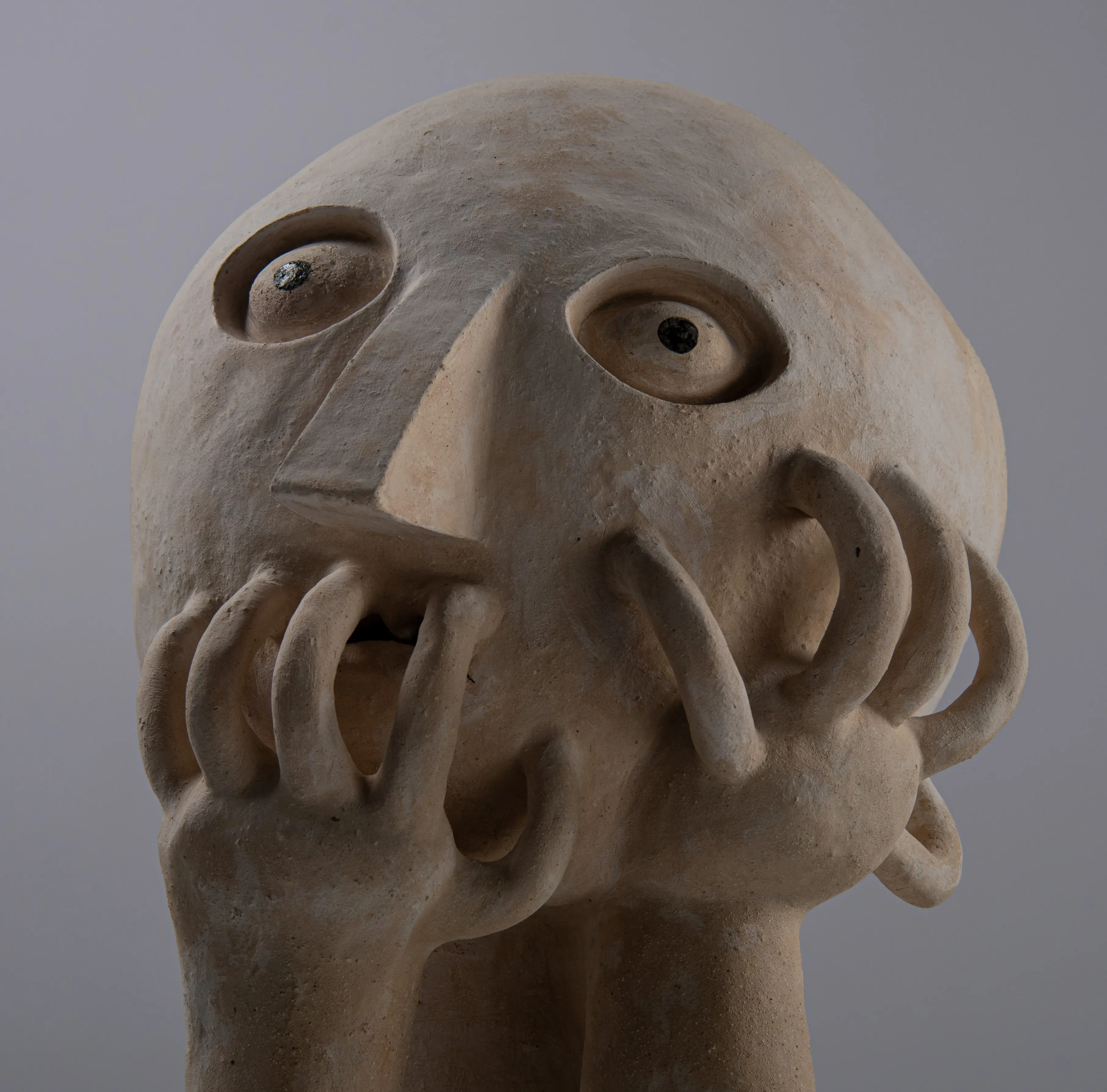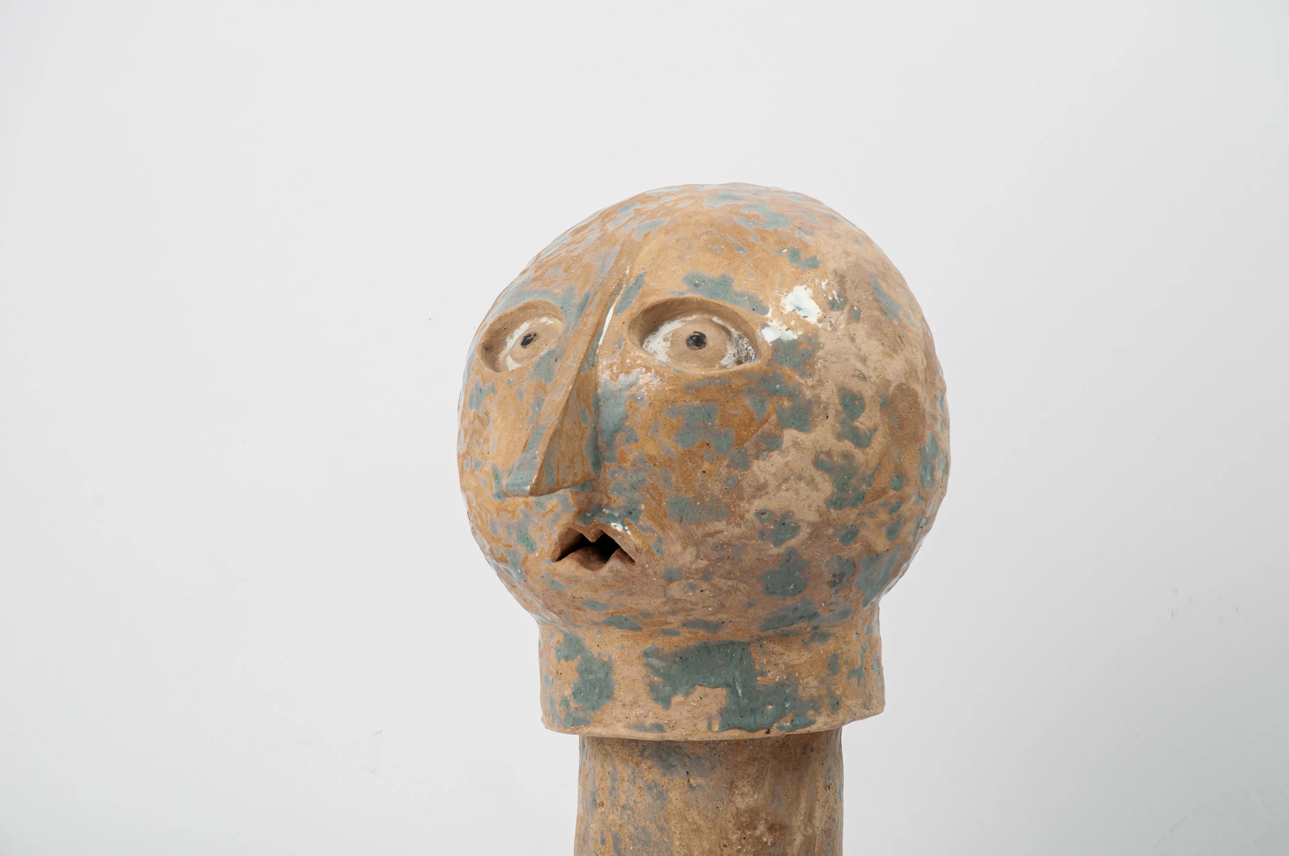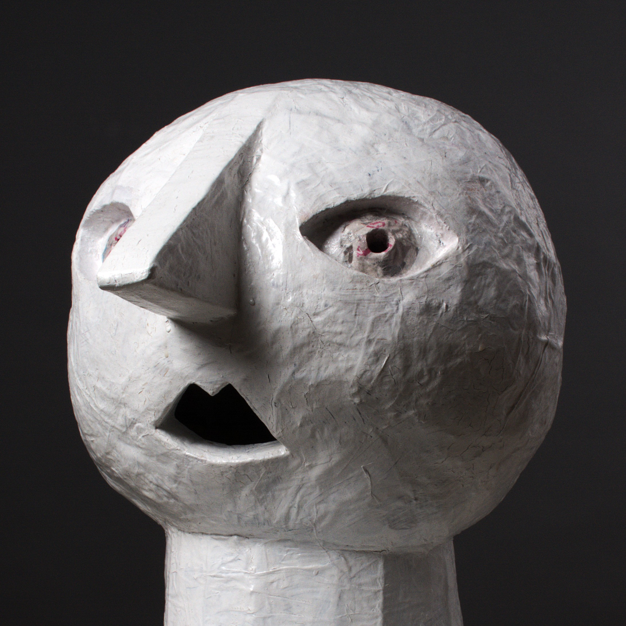 Although it is made up of abstract shapes, its entire surface is roughly structured and gives it an organic character. Its rounded and simplified forms, together with the expression on the face, are to underline the child's naivety and and grotesqueness. This shell with missing limbs emphasizes the limitation and deprivation of naturalness, symbolizing forced integration into society. Nothing of himself is admitted to him, only taken away.