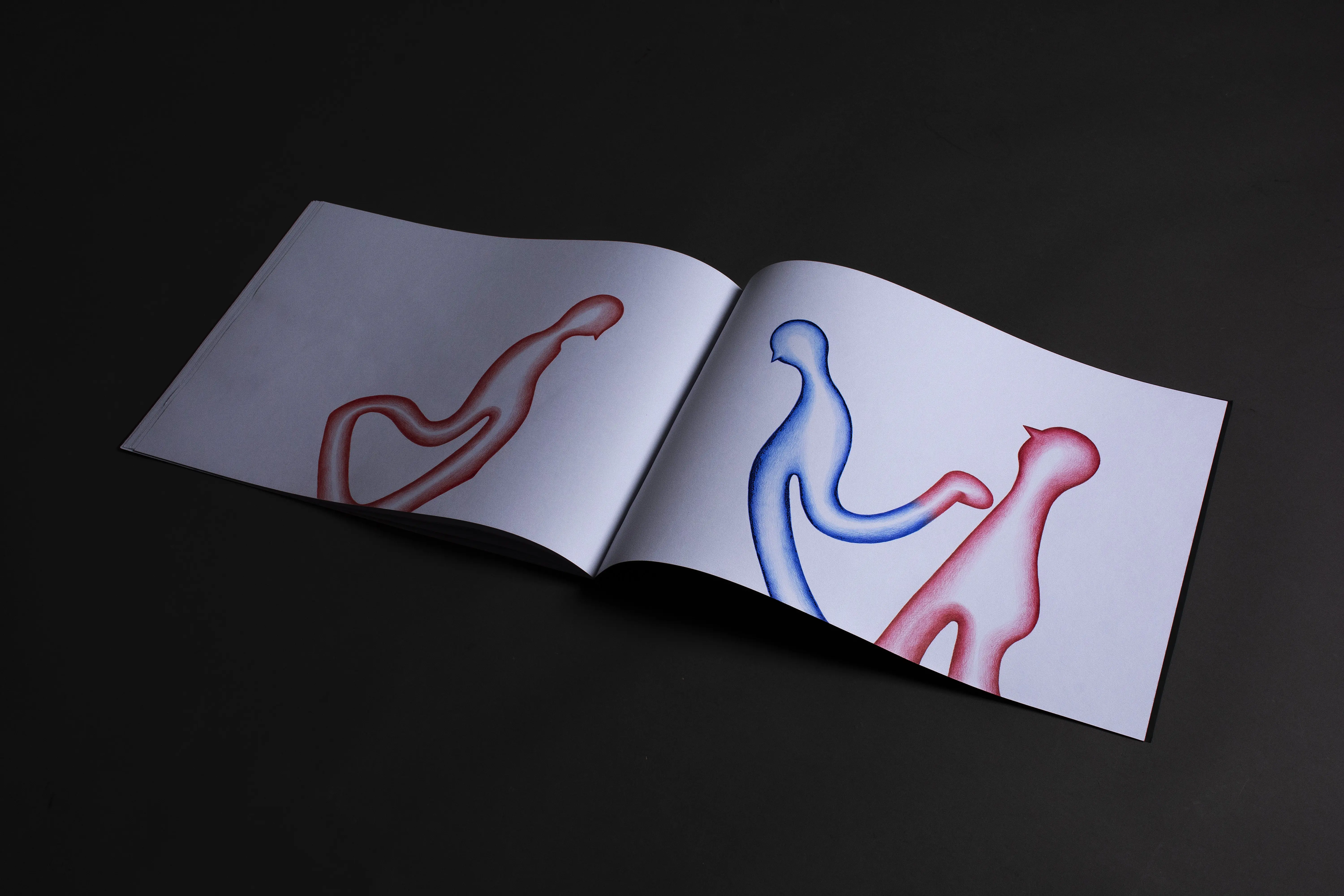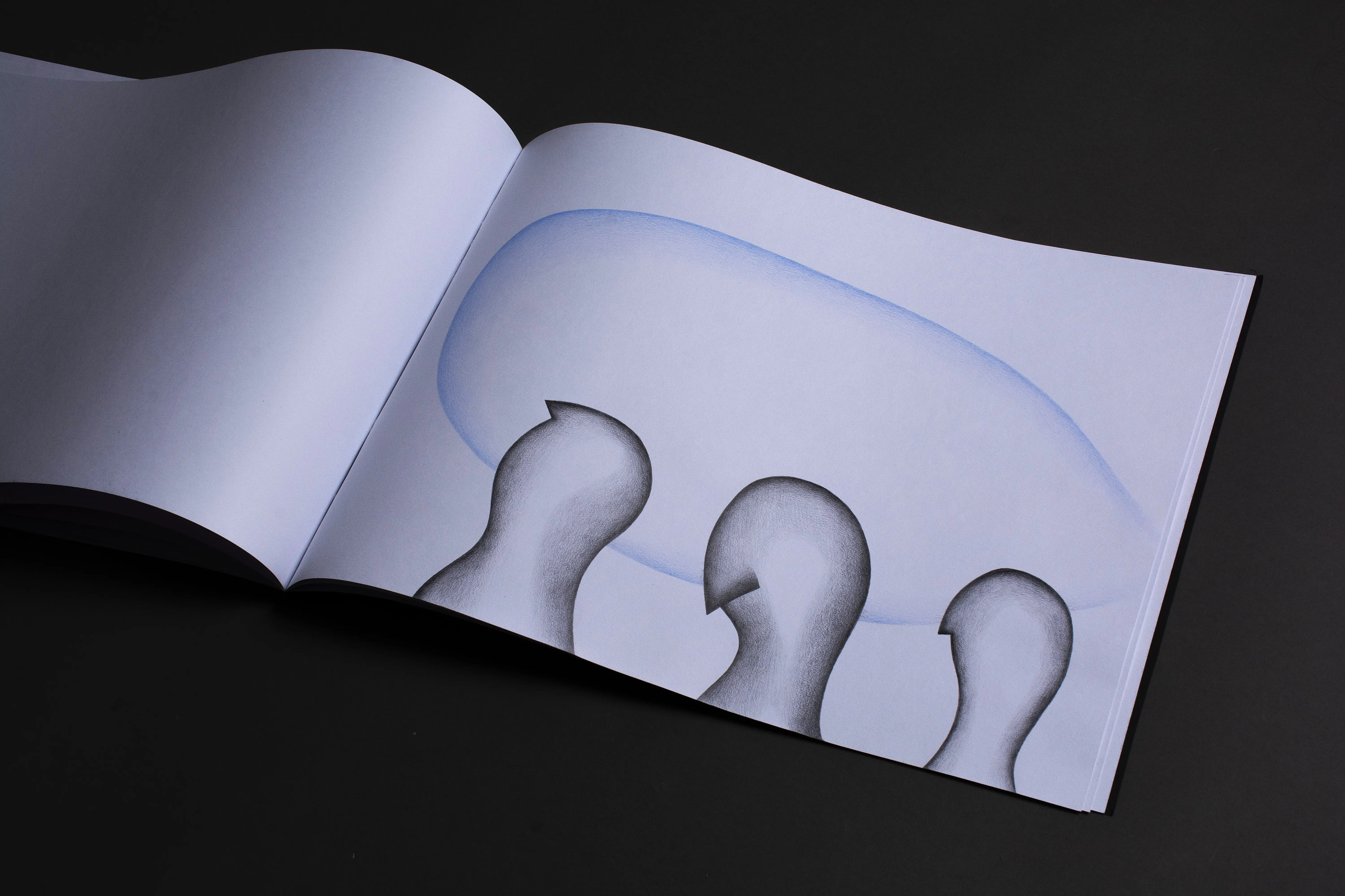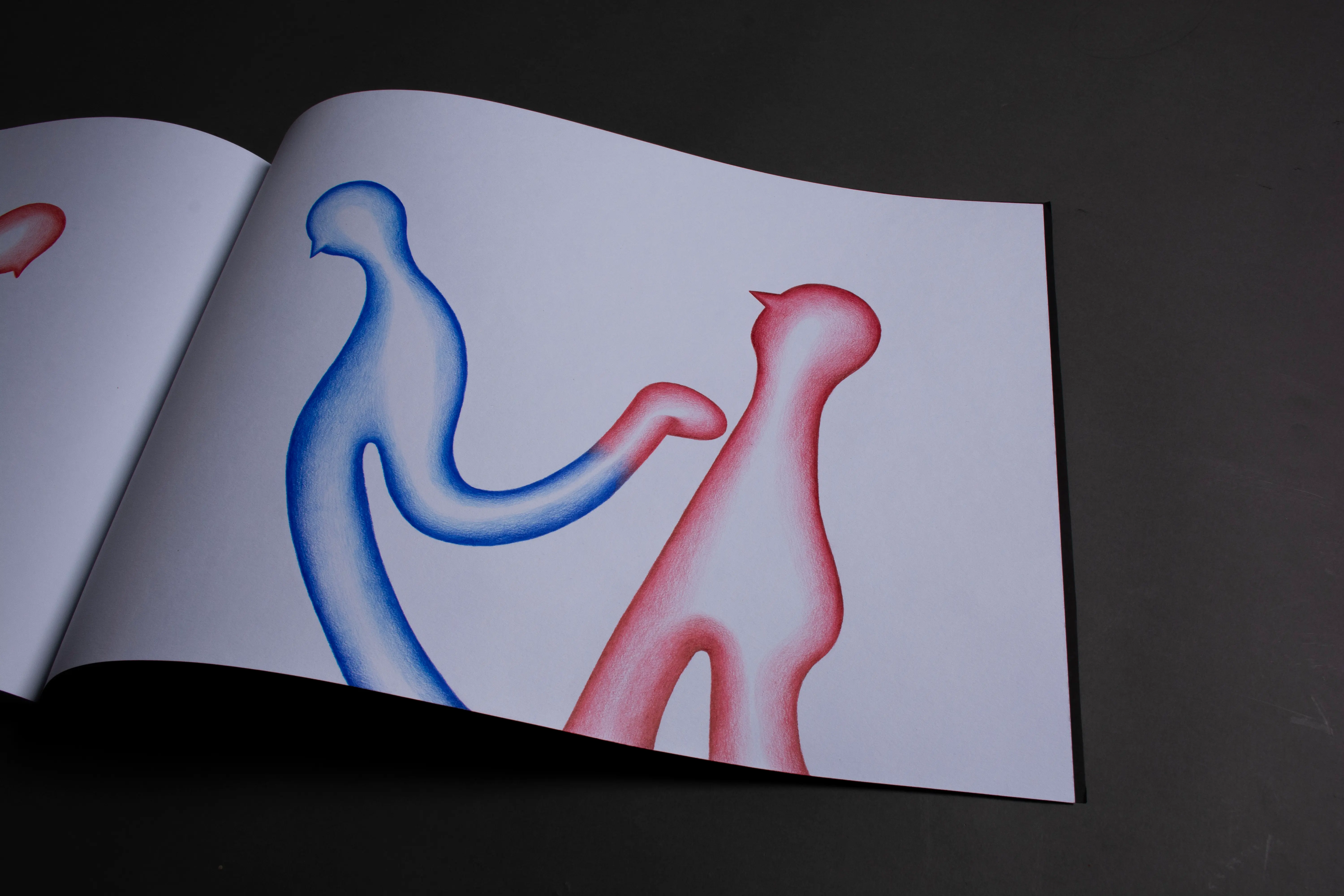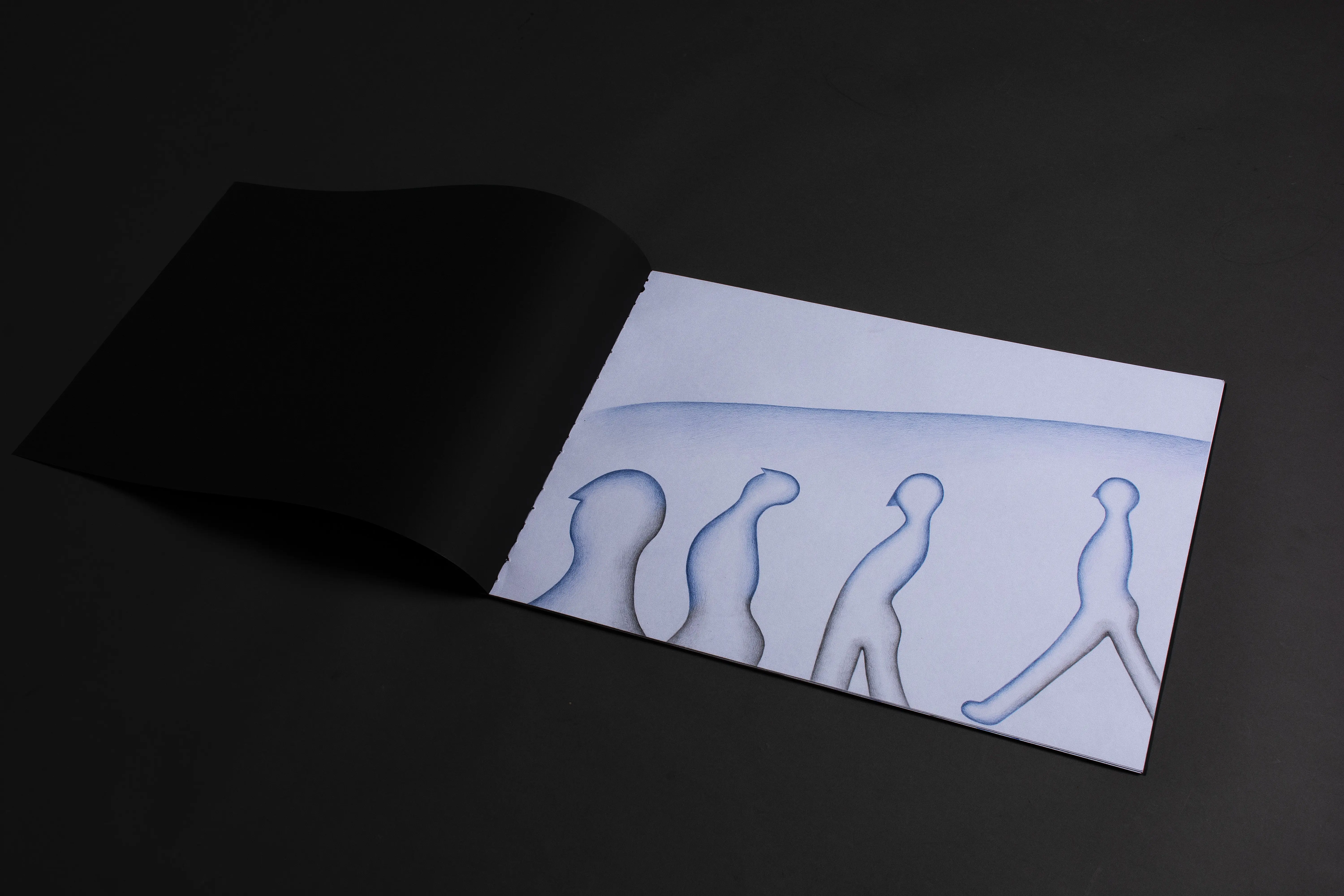 The fundamental inspiration for this artist's book was the performative video Catching the Wind. This performance, set in the open environment of infinite fields, became the key impulse for the book's creation. The landscape creates a dimension of infinity and continuity, in which the figures become carriers of action and the creative process itself. The stylization of the figures draws from the ceramic sculptures in the Balance on the Edge series. The principle of balance, tension, and fragile stability that becomes a connecting element between performance, sculpture, and intermedial expression.
